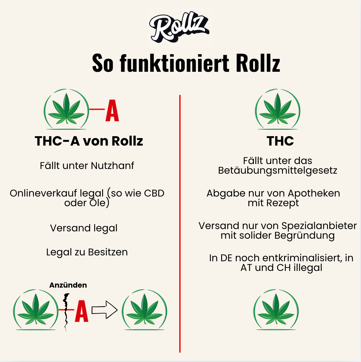 Rollz Pflanzen enthalten einen hohen THC-A Wert. THC-A ist nicht reguliert. Wenn du eine Blüte mit 29% THC-A Wert anzündest, wird THC-A zu THC. Die gleiche Wirkung, aber wir können legal in die EU liefern.